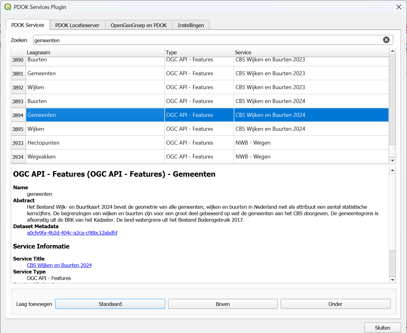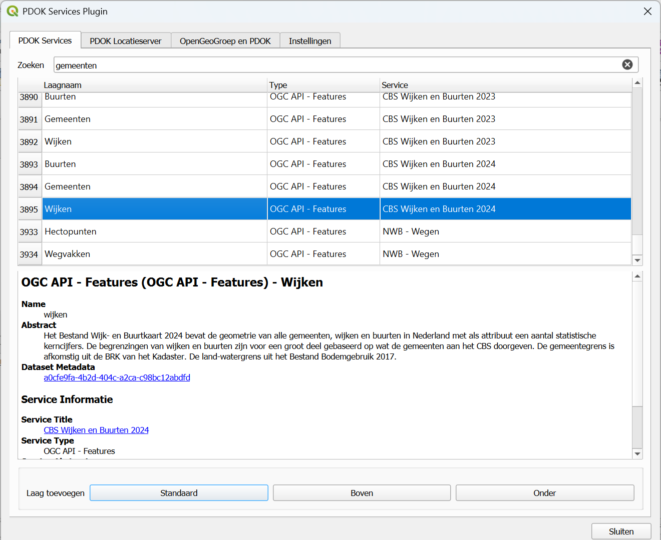 in de toolbar. - Zoek Gemeenten van de CBS Wijken en Buurten 2024 Service zoals in onderstaande screenshot en voeg het toe aan je project door op Standaard te klikken.