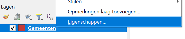 5. Ga naar het Lagenpaneel en klik met de rechtermuisknop op Gemeenten. Kies Eigenschappen uit het menu.