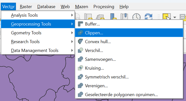 - Ga in het hoofdmenu naar Vector | Geoprocessing Tools | Clippen....