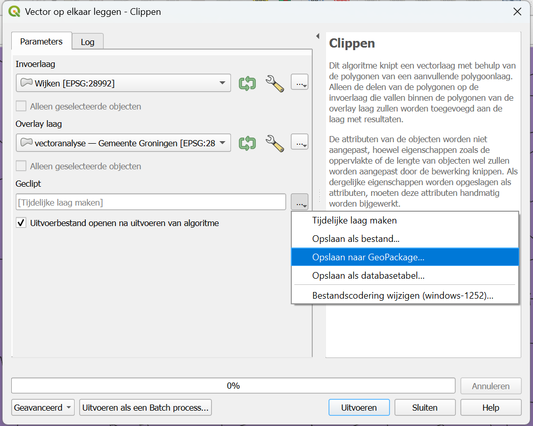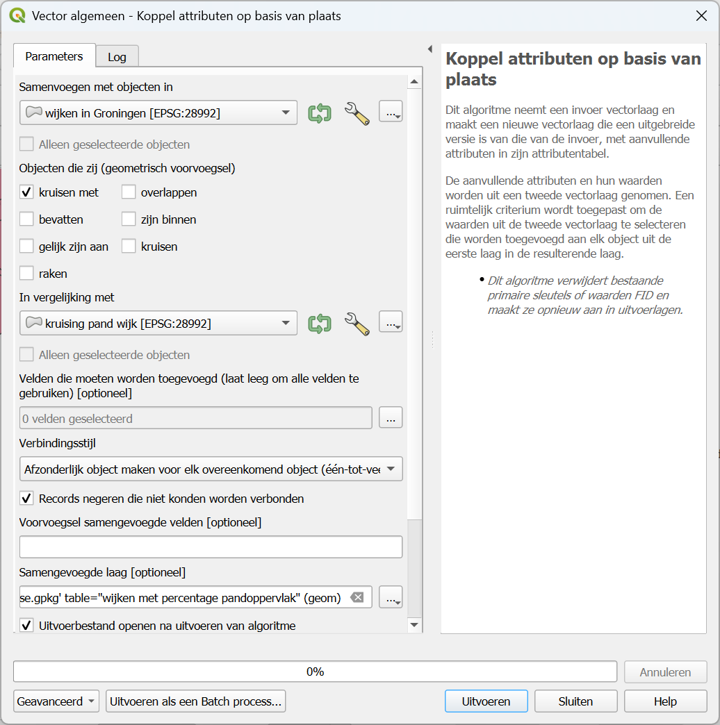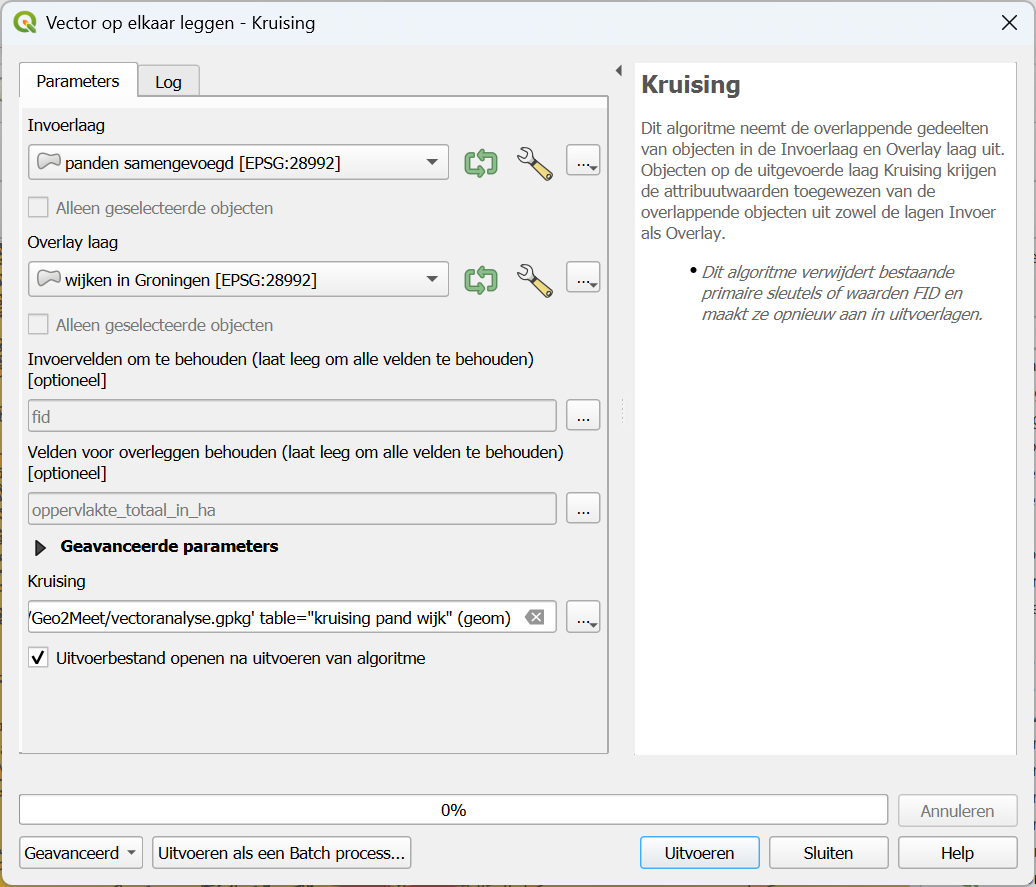 4. Sla de laag op in de bestaande vectoranalye.gpkg en noem het kruising pand wijk. Klik op Uitvoeren.