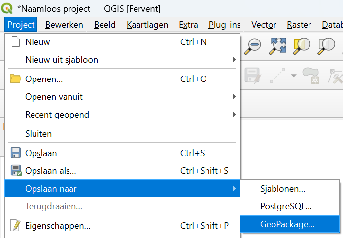 2. Ga in het hoofdmenu naar Project | Opslaan naar | GeoPlackage....