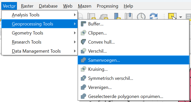 - Ga in het hoofdmenu naar Vector | Geoprocessing Tools | Samenvoegen....