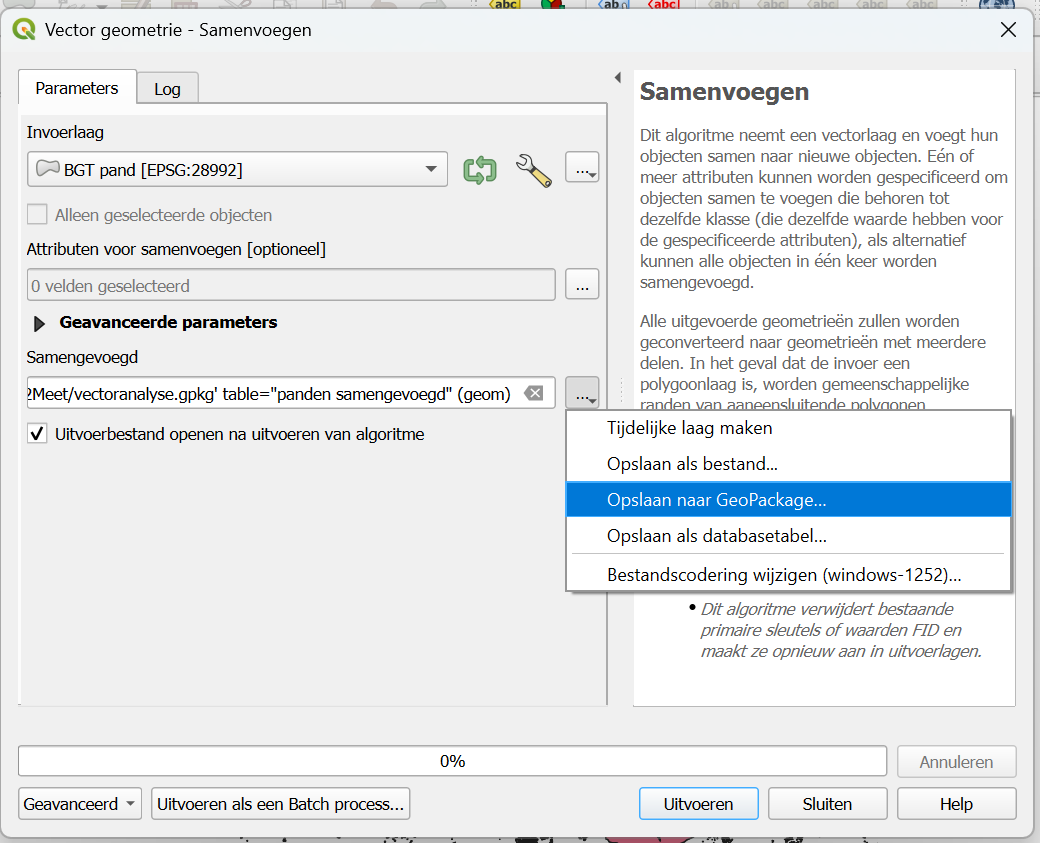 2. Selecteer in het dialoogvenster als Invoerlaag de BGT pand laag en navigeer naar de bestaande vectoranalyse.gpkg GeoPackage. Geef als laagnaam panden samengevoegd.
