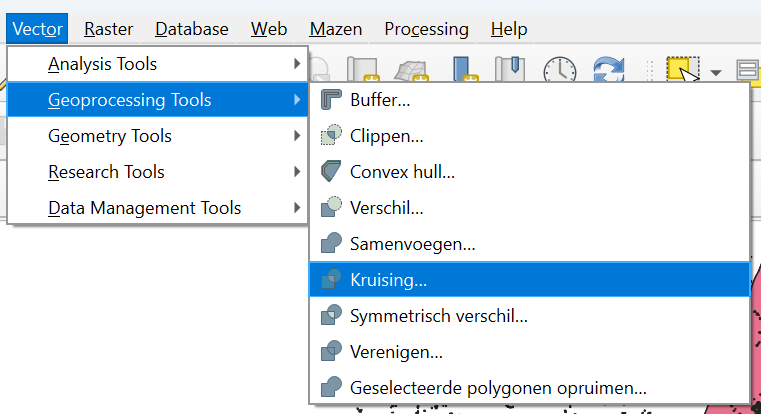 - Kies in het hoofdmenu Vector | Geoprocessing Tools | Kruising....