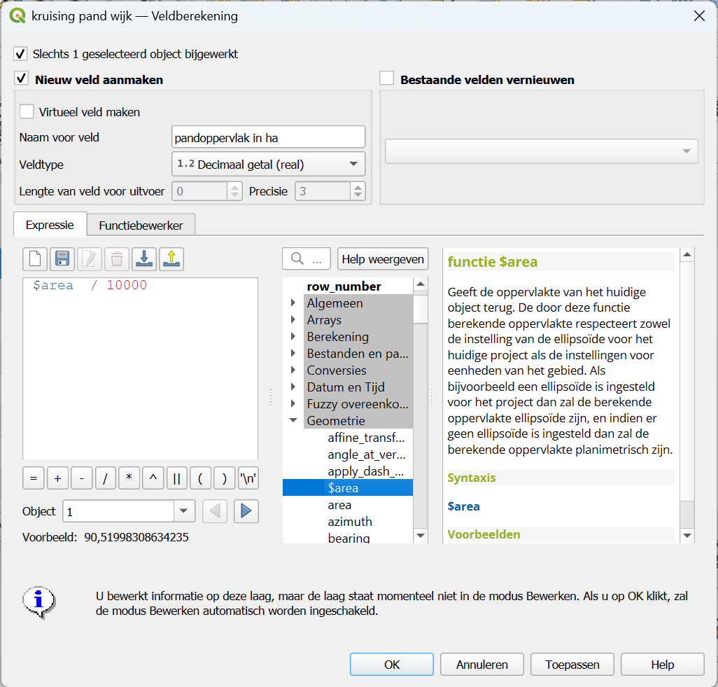 $areafunctie en dubbelklik om die toe te voegen aan de expressie. Om m2 converteren naar hectare moet er nog gedeeld worden door 10.000. De expressie ziet er dan uit zoals de screenshot hieronder.