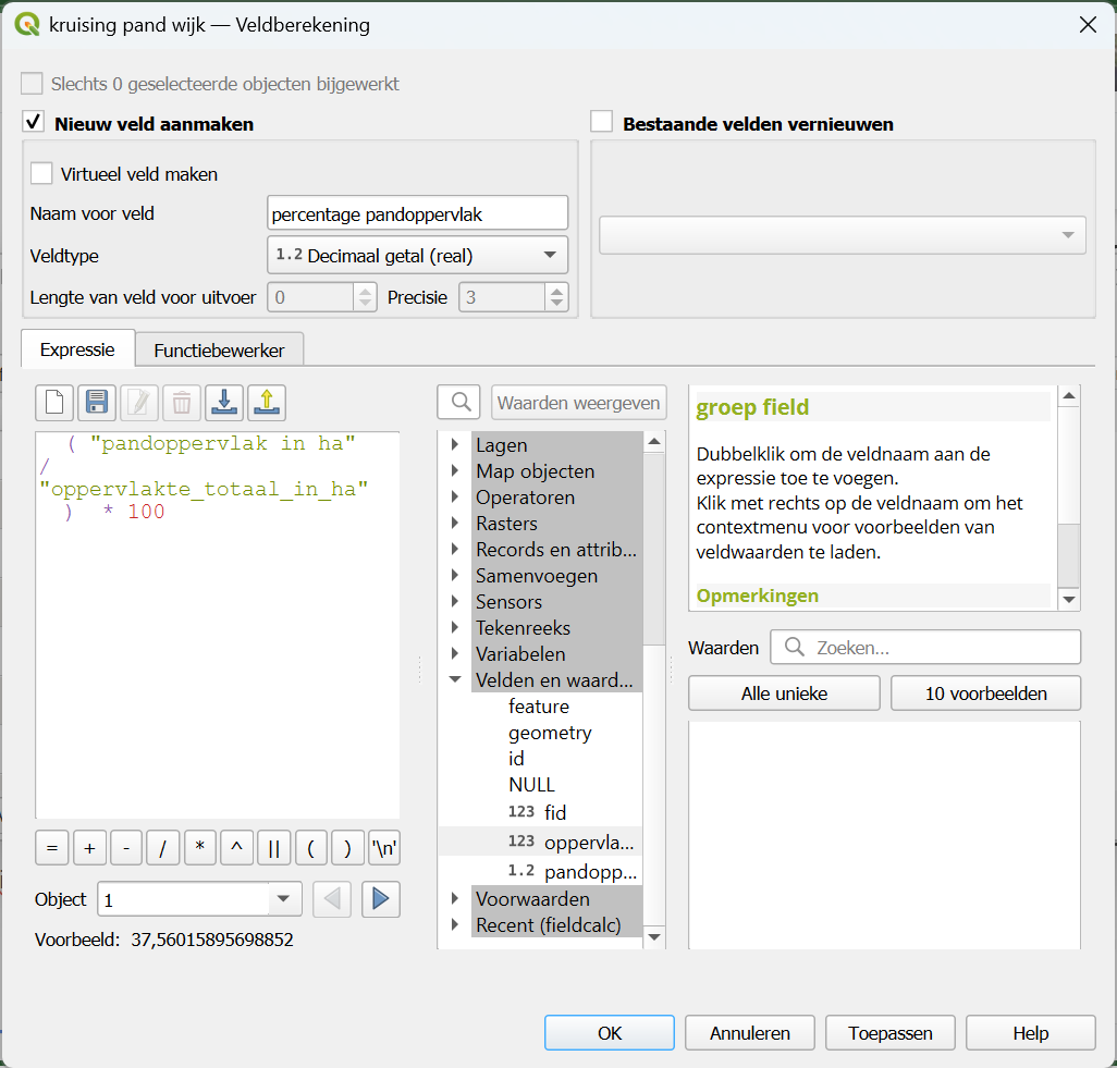 percentage pandoppervlakmet Veldtype Decimaal getal (real). - Om het percentage te berekenen moeten we de volgende expressie formuleren: