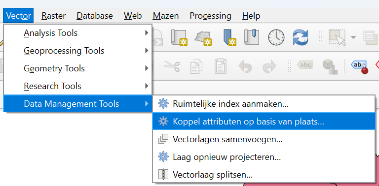 - Ga in het hoofdmenu naar Vector | Data Management Tools | Koppel attributen op basis van plaats....
