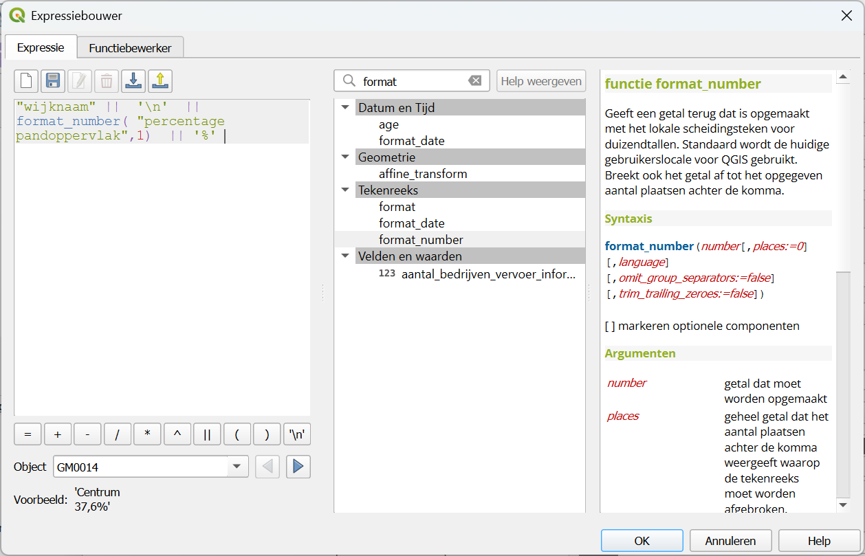 Hier betekent || dat we een string (tekst) plakken aan het voorgaande. '\n' betekent dat we naar een nieuwe regel gaan. Met de functie format_number() kunnen we aangeven hoe we de getallen willen afronden. In dit geval met 1 decimaal.