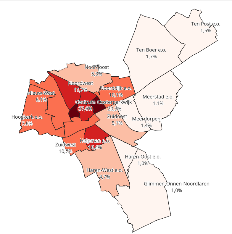 We gaan eerst uitrekenen welk percentage van de oppervlakte van wijken in Groningen is bebouwd met panden. Vervolgens gaan we uitrekenen hoeveel gebouwen er liggen binnen 500 meter van het hoofdstation van Groningen. We gebruiken hiervoor data van de BGT, het CBS en OpenStreetMap.