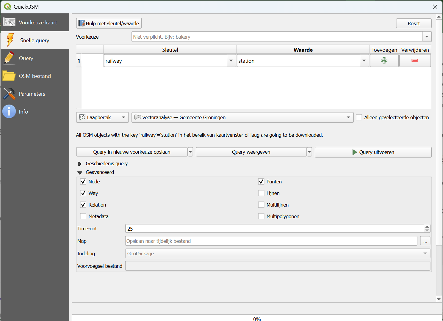 4. Sla het resultaat op in de bestaande GeoPackage (vectoranalyse.gpkg) met de laagnaam Station Groningen.