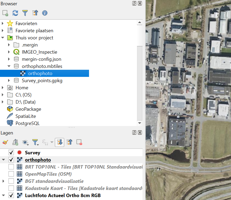 9. Ga in het Browser-paneel naar Thuis voor project om alle bestanden in je projectmap te bekijken en sleep de laag orthophoto.mbtiles naar het kaartvenster.