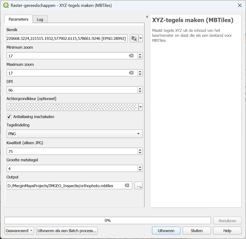 6. Sla het resultaat (orthophoto.mbtiles) op in dezelfde map als je Mergin Maps-project. Alleen dan wordt het later gesynchroniseerd.