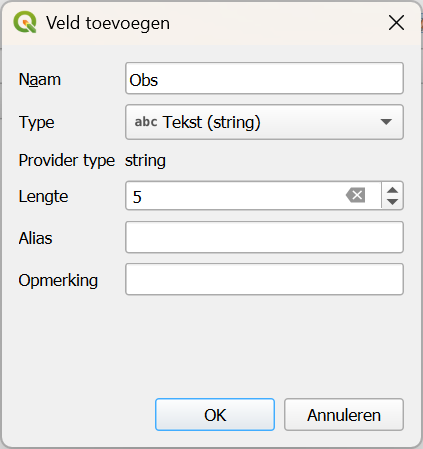4. Typ in het dialoogvenster Veld toevoegen bij Naam: Obs, kies Tekst (string) als type (zodat we alfanumerieke codes kunnen invoeren voor onze observatienummers), en stel de Lengte in op 5 tekens.