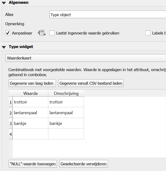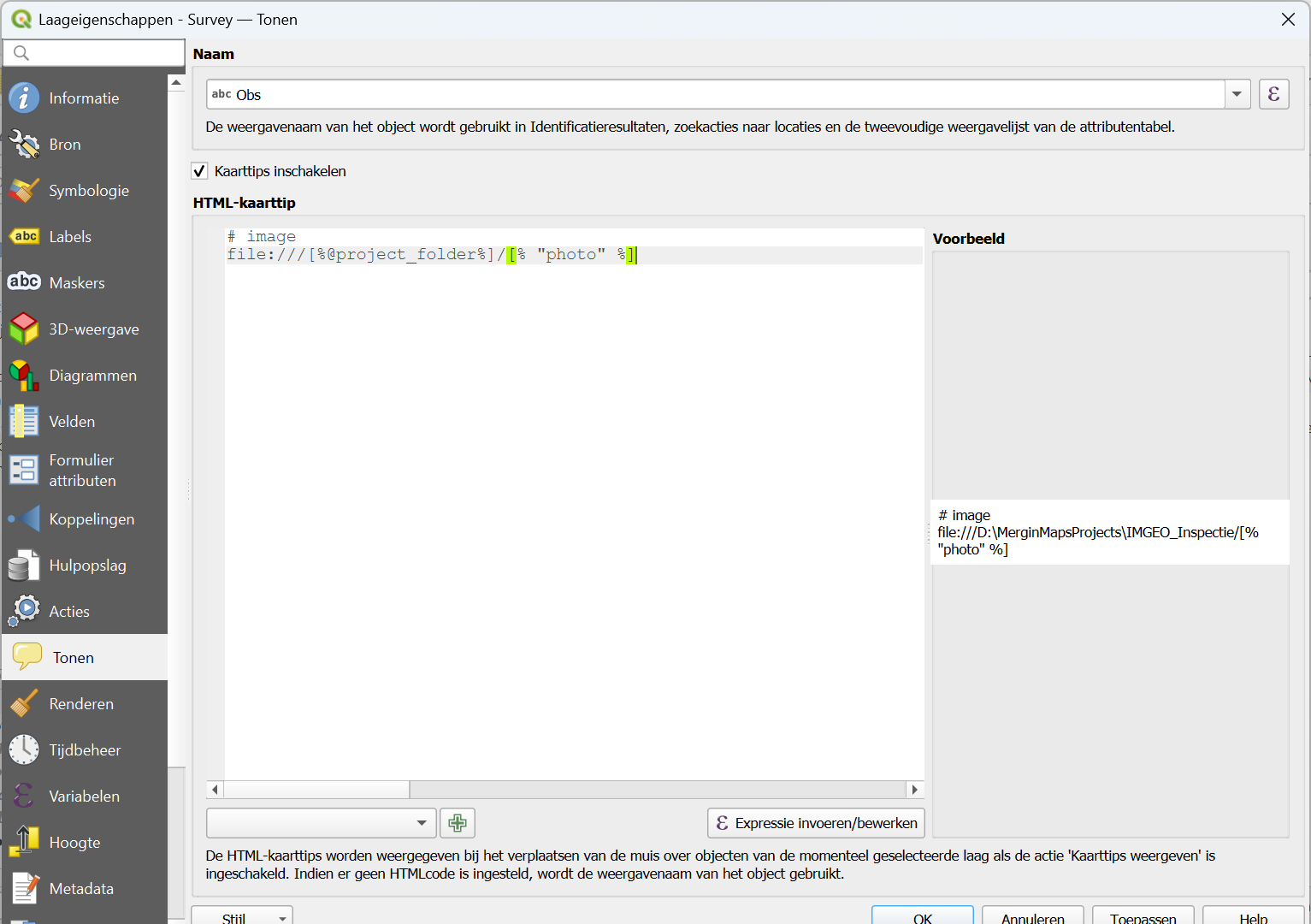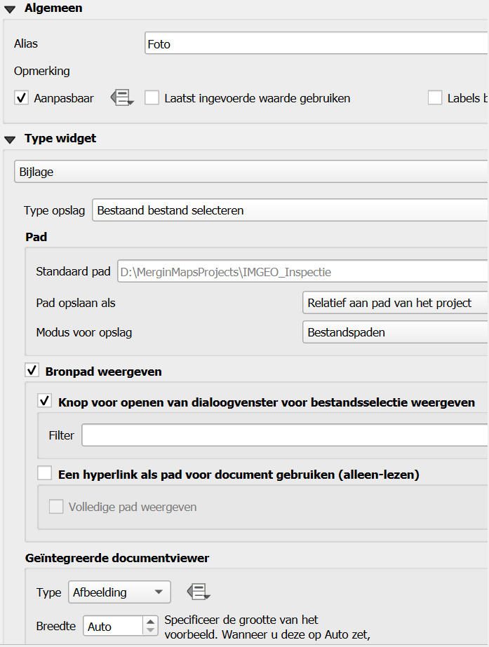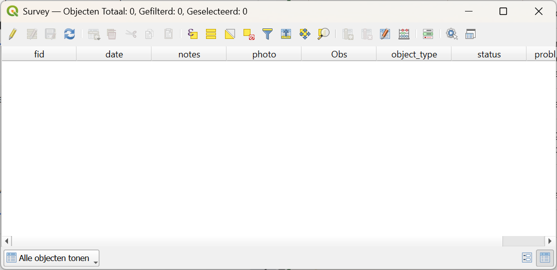 Je ziet dat er al enkele attributen aanwezig zijn: fid, date, notes, photo. Laten we nu een paar extra velden toevoegen die relevant zijn voor IMGEO inspectie.
