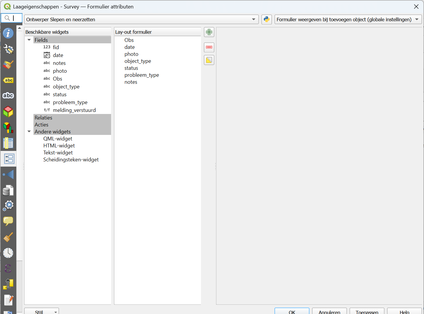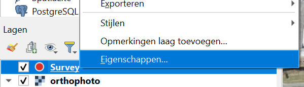 Om de Formulierwidgets in te stellen, klik je met de rechtermuisknop op de Survey-laag in het Lagen-paneel en kies je Eigenschappen... in het contextmenu.