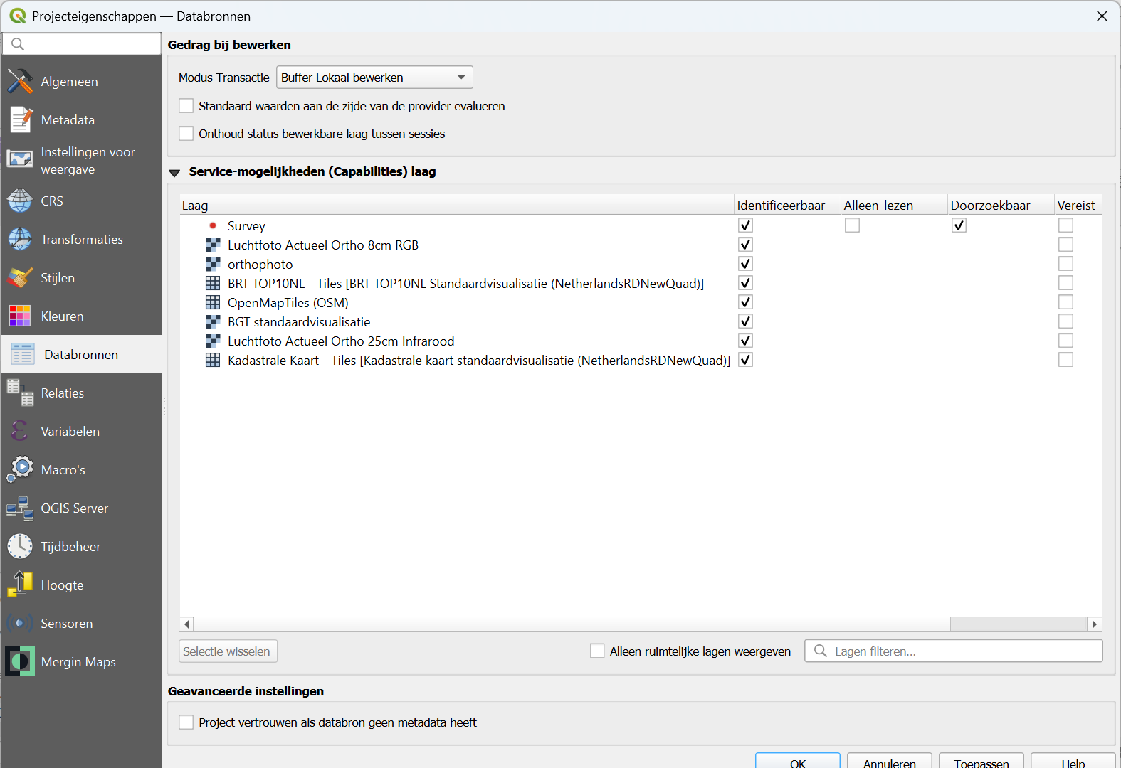 2. Ga naar het tabblad Databronnen. Daar moet je controleren of de survey-laag niet is ingesteld op Alleen-lezen. Lagen die op Alleen-lezen staan, kunnen niet worden bewerkt in het veld en zijn alleen zichtbaar als achtergrondlagen.