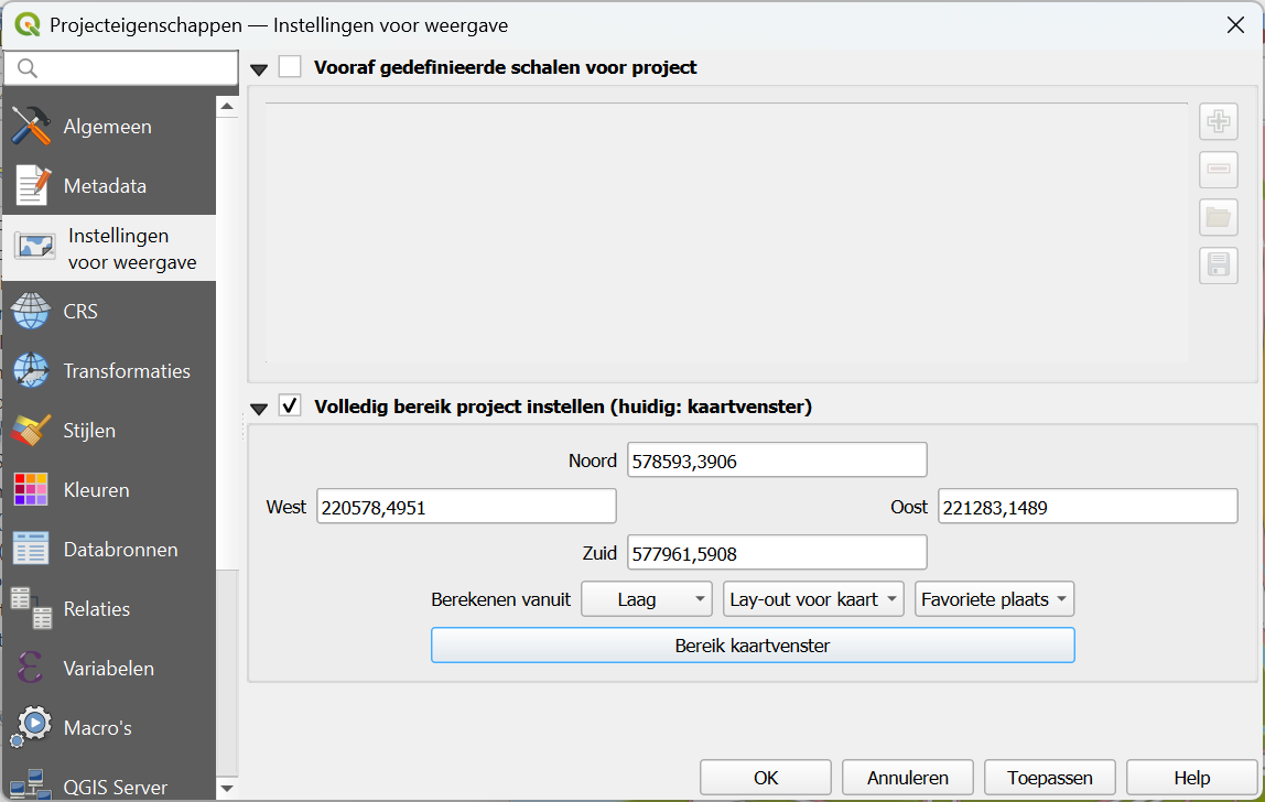 Hier kun je het kaartbereik van het project instellen. Dit bepaalt het gebied dat wordt weergegeven wanneer je naar de volledige extent inzoomt.