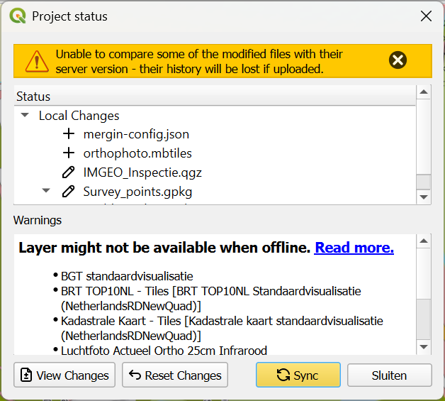 Natuurlijk kunnen we ook bestaande raster- en vectorlagen aan ons project toevoegen. Zorg er dan voor dat ze zijn opgeslagen in de project map van het Mergin Maps project, omdat ze anders niet worden meegesynchroniseerd.