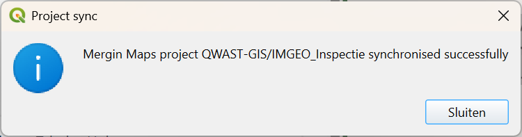 Klik op Sluiten om het dialoogvenster te sluiten dat aangeeft dat het Mergin Maps-project succesvol is aangemaakt en geüpload.