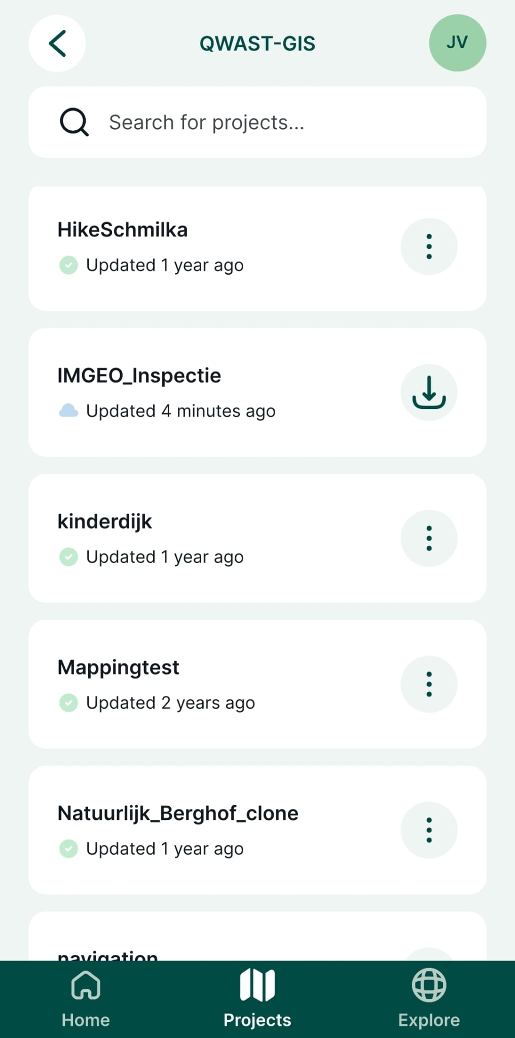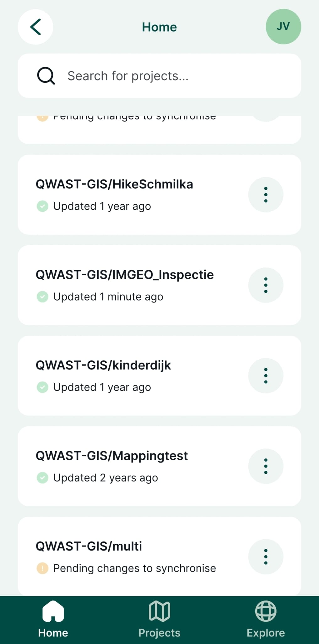 In vierkante haken staat de workspace (bijvoorbeeld [QWAST-GIS]). Als je voor deze cursus toegang hebt tot een andere workspace, klik dan met je rechtermuisknop op Mergin Maps en kies Switch workspace uit het contextmenu. Kies vervolgens in de popup de workspace waarin je wilt werken. Je ziet dan de projecten in deze workspace.