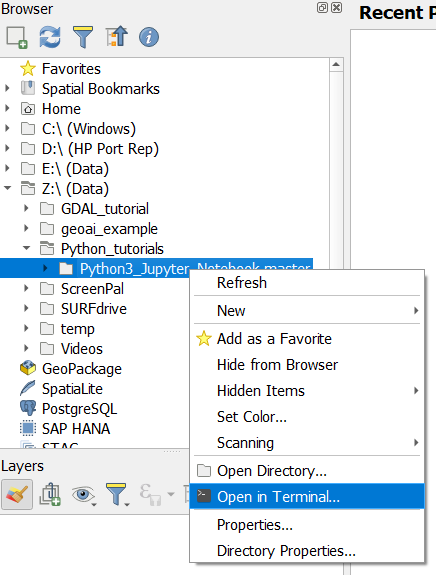 4. Navigate in the Browser panel to the folder with the Jupyter Notebooks, click right and choose Open in Terminal... from the context menu.