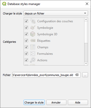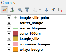 Pour les deux couches restantes (communes_bougie et routes_bloquées) vous allez apprendre à charger des styles à vos couches. Ces styles sont de format .sld et se trouvent dans le dossier des donnés pour l’exercice 4.