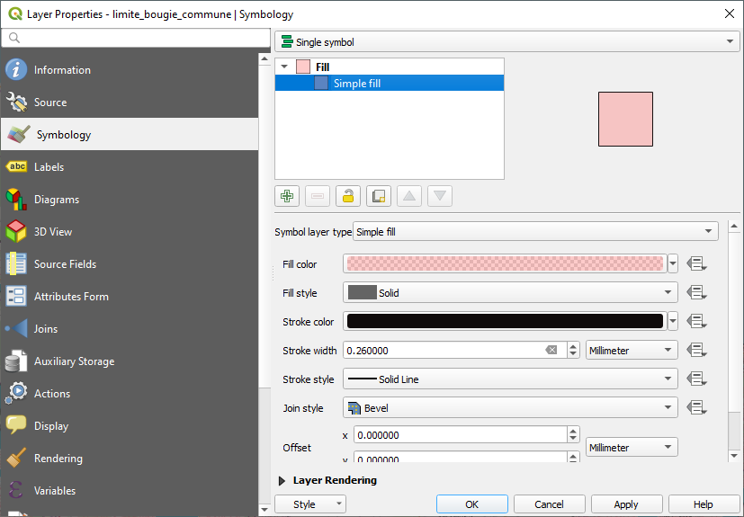 - Le style attribué à cette couche est similaire à celui de zone_1000m. Modifiez la couleur du remplissage en rouge saumon et la couleur du trait en noir. Puis Cliquez sur OK