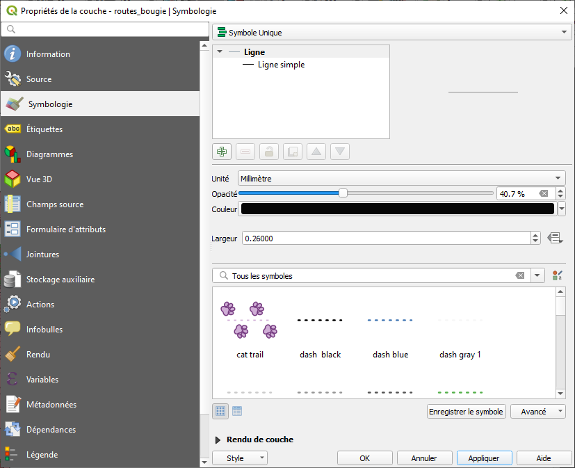 Choisissez la couche routes_bougie et puis allez aux propriétés 🡺 Symbologie et ajustez les paramètres tel que illustré ci-dessous :