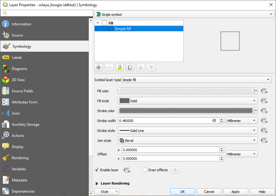 Choisissez maintenant wilaya_bougie 🡺 Propriétés 🡺 Symbologie et changez les paramètres comme dans la fenêtre qui suit :