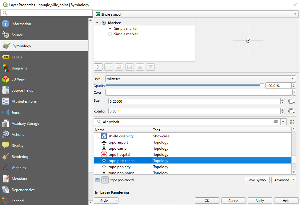 Allez dans la liste des symboles enregistrés en bas de la fenêtre de symbologie et choisissez le symbole dont le nom est topo pop captial