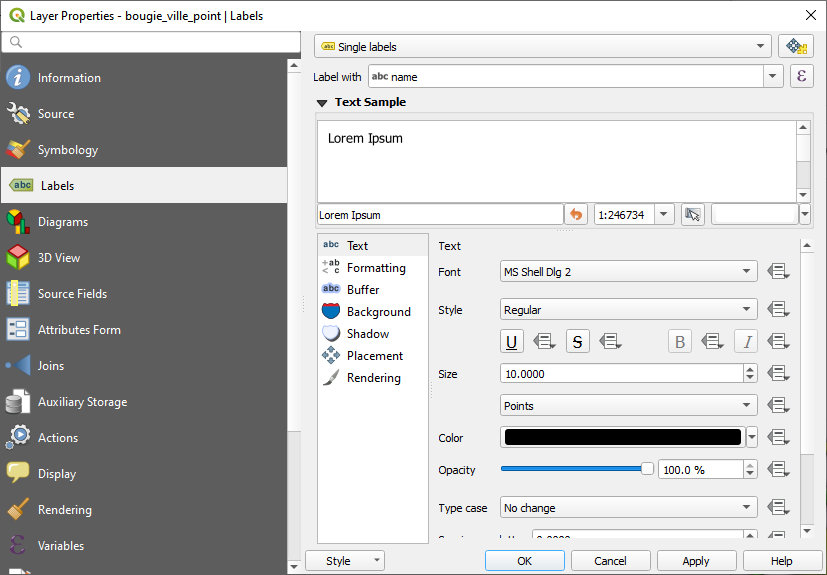 Nous commençons maintenant par le style des couches vectorielles. Chaque couche se voit attribuer un style aléatoire lorsque vous l'ouvrez. Le style couvre les couleurs, les formes, les tailles et les étiquettes de texte. Le style se fait sous les propriétés de chaque couche (clic droit sur le calque) ou en utilisant le panneau Style de la couche en appuyant sur <F7>.