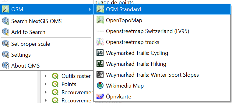 - En arrière-plan, une image satellite ou une carte globale peuvent être utilisées comme images de fond à partir du pluginQuickMapServices. Dans le menu, choisissez Web 🡺QuickMapServices ou OpenLayers plugin🡺OSM standard 🡺OSM. Ceci est une étape optionnelle.
