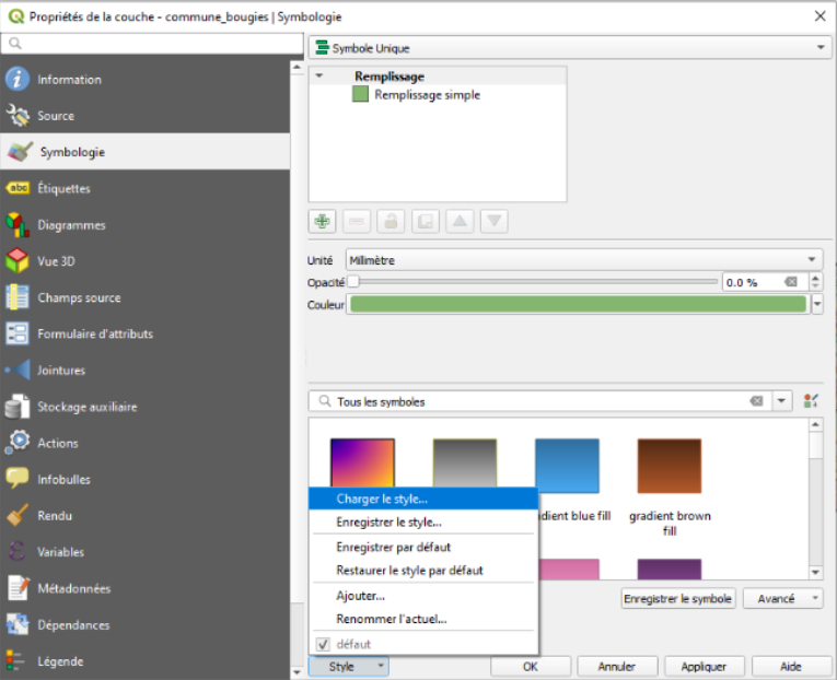 Choisissez la couche communes_bougie et avec le bouton droit allez à Propriétés 🡺 symbologie. En bas, cliquez sur le bouton Style 🡺 Charge un Style Cliquez sur Charger Style, puis OK.
