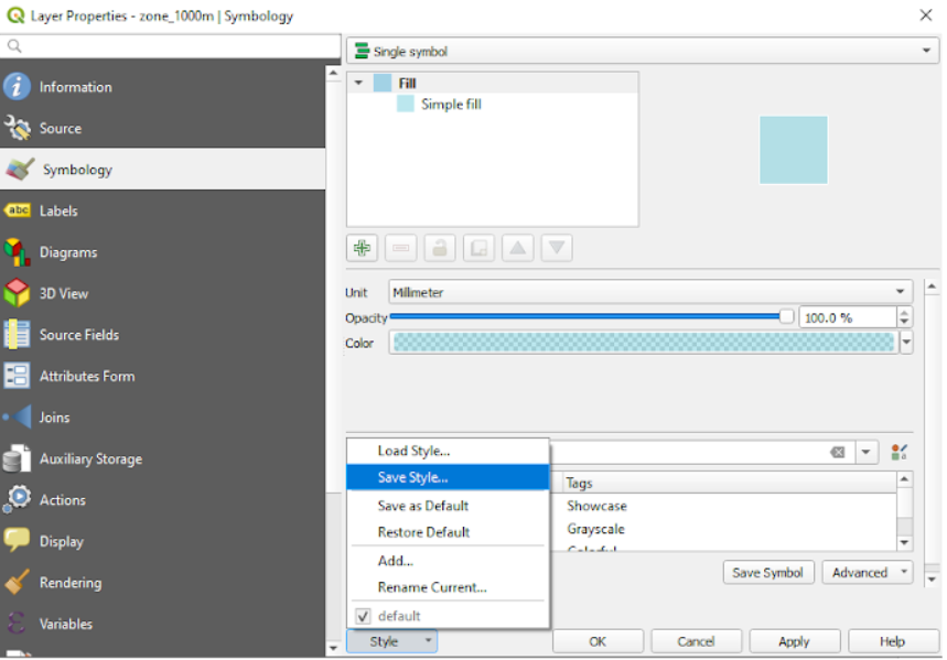 Sauvegardons les styles des couches de ce projet dans des fichiers .sld. Pour ce faire, retournez dans la boîte de dialogue Symbologie de la couche zone_1000m par exemple et sélectionnez Style 🡺 Enregistrer le style 🡺 Fichier SLD
