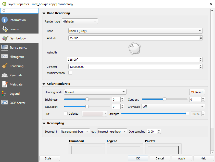Sur la couche dupliquée 🡺 Propriétés 🡺 Symbologie et choisissez en type du rendu Ombrage (hillshade). Changez les paramètres de la boite du dialogue comme dans la figure ci-dessous :