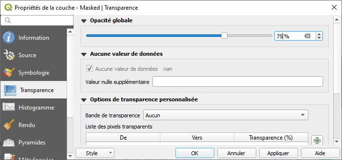 Sur la couche mnt_bougie allez à propriétés 🡺 Transparence 🡺 et changez la transparence à 50%. Cliquez sur OK