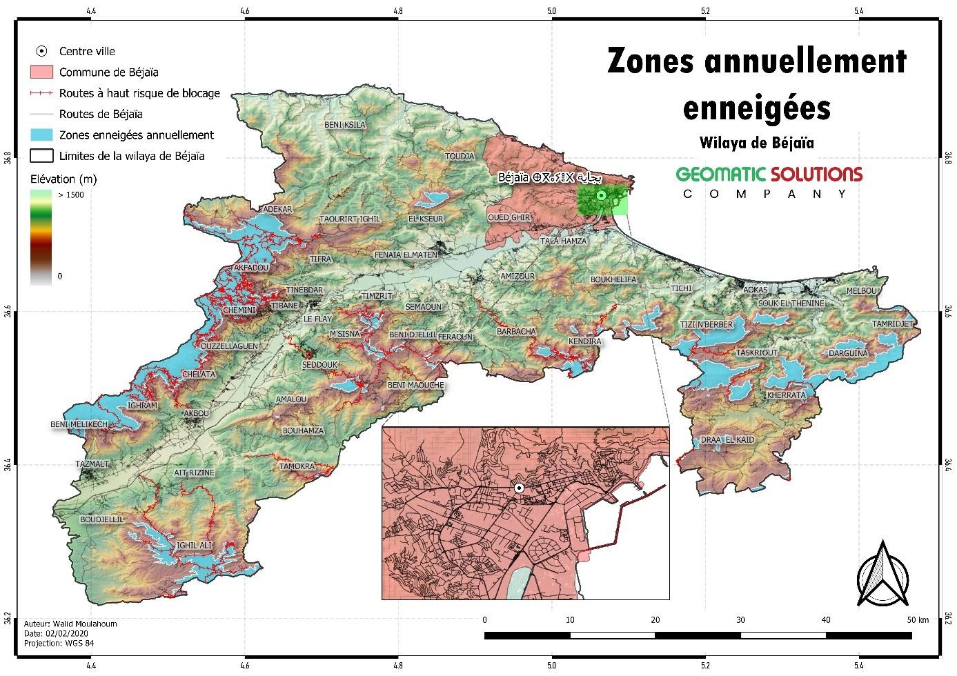 Vous allez essayer de concevoir une carte représentant la variation d’élévation dans la wilaya de Béjaïa en précisant tous les autres éléments que vous avez styler jusqu’à maintenant. Vous pouvez vous inspirez de la carte préalablement conçue dans la figure ci-dessous. Critiquez cette carte ? Quels sont les points forts de conceptions ainsi que les points faibles ?