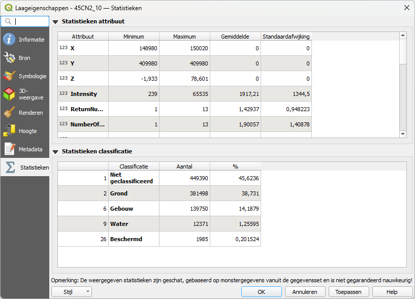 In bovenste tabel kan je de attributen en hun statistieken zien (minimum, maximum, gemiddelde, standaardafwijking). In de onderste tabel kan je de statistieken voor het classificatieattribuut zien. De kolom Aantal toont het aantal punten in de klasse en de kolom % toont het percentage punten met die klasse.