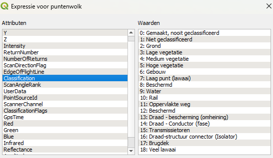 Nu kan je een expressie formuleren. In de linkerbovenhoek zie je de beschikbare attributen in de point cloud-laag en in de rechterbovenhoek zie je de waarden van een geselecteerd attribuut. Voor de meeste attributen worden de statistieken weergegeven. Voor het classification-attribuut wordt het nummer van de klasse en de beschrijving weergegeven.
