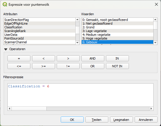 Nu kunnen we een expressie formuleren om punten geclassificieerd als Gebouw eruit te filteren.