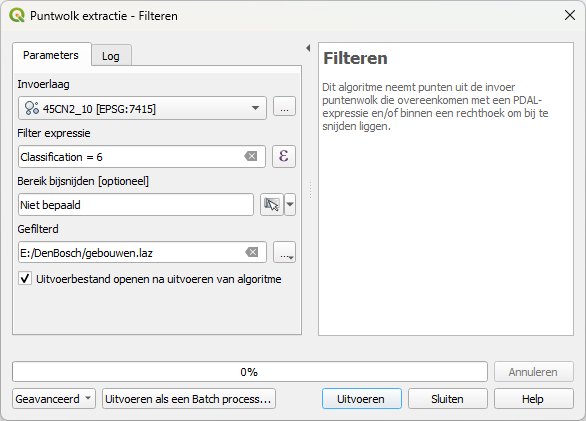 10. Sla het resultaat op als vegetatie.laz en klik op Uitvoeren.