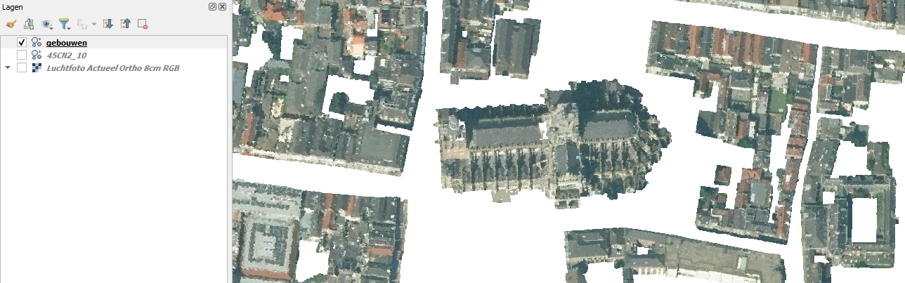 12. Verberg na de automatische conversie naar het COPC-formaat de originele point cloud-laag in het Lagen-paneel, zodat we de punten van de gebouwen in de gebouwen-laag kunnen zien.