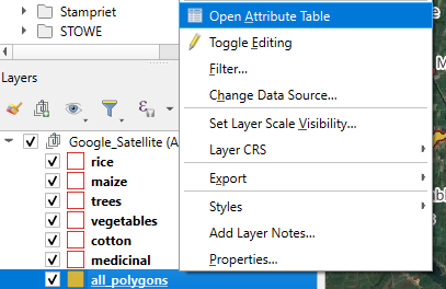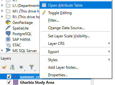 4. In the Layers panel click right on the summer_crop_samples layer and choose Open Attribute Table from the context menu.