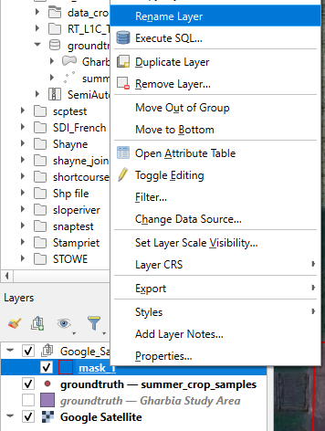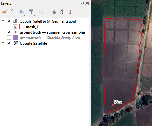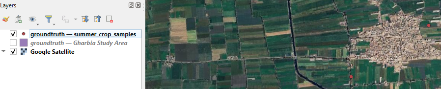 1. Hide the Gharbia Study Area layer and make sure that the summer_crop_samples layer is on top of the Google Satellite layer.