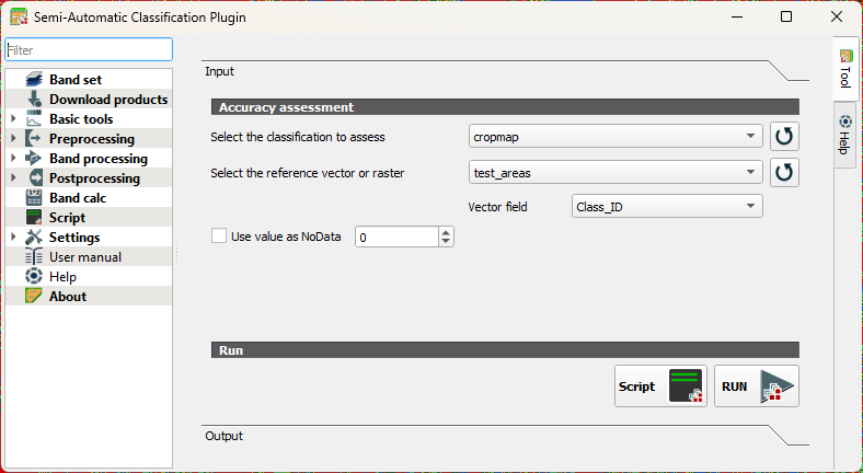 - Under Input, choose the cropmap as the classification to assess and select test_areas that we have created before as the reference vector. Use the