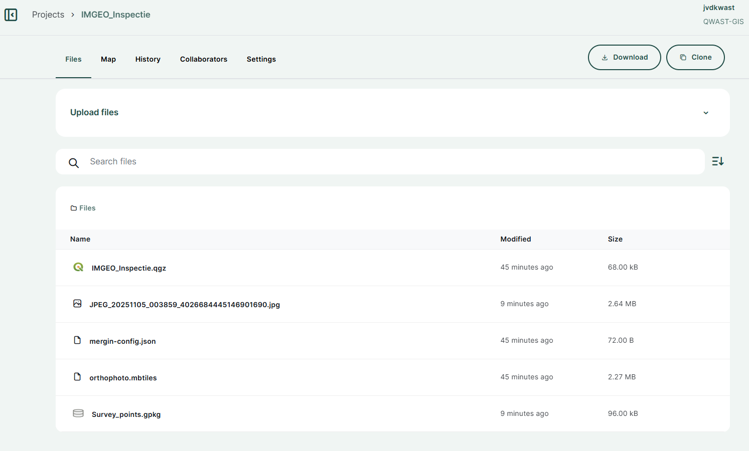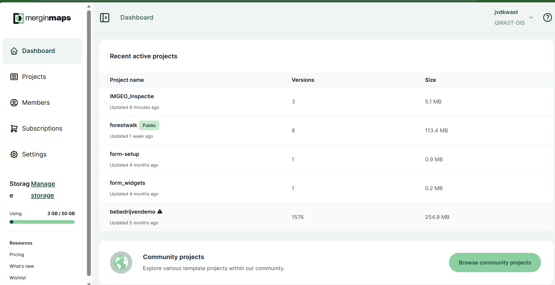 Mergin Maps houdt alle transacties met de cloudservice bij. Je kunt ook samenwerken aan een project of een werkruimte voor je organisatie aanmaken. Laten we eens kijken naar het dashboard.