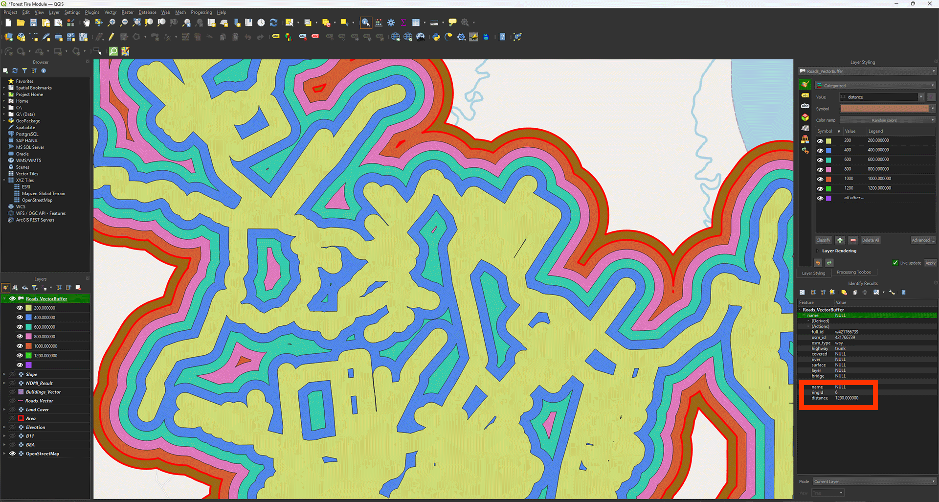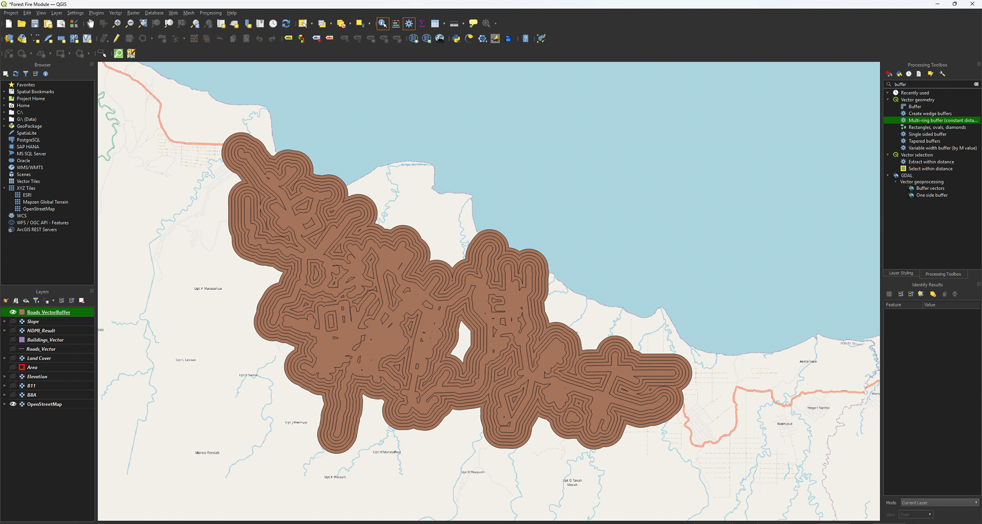 We downloaded vector layers of the roads and buildings in our study area. Fires often start near human activity, so we want to take that into account for our analysis. The closer an area is to human settlements, the more susceptible it is to fire. Creating a buffer around the roads and buildings will show which areas on the map are in close proximity to them, and thus at risk.
