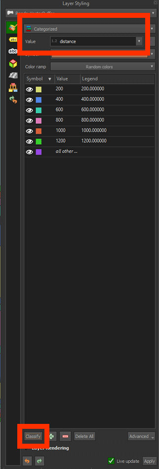 Now we can see that the buffer shows colours based on the value we gave before. Every colour is a width of 200 meters, neatly categorised.