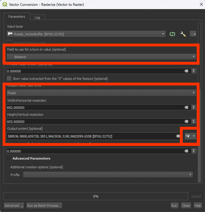2. In the Rasterize window, make sure Set A fixed value to burn is set to 1. We need to use this now as we don’t have a field to use like we did with the Roads buffer.