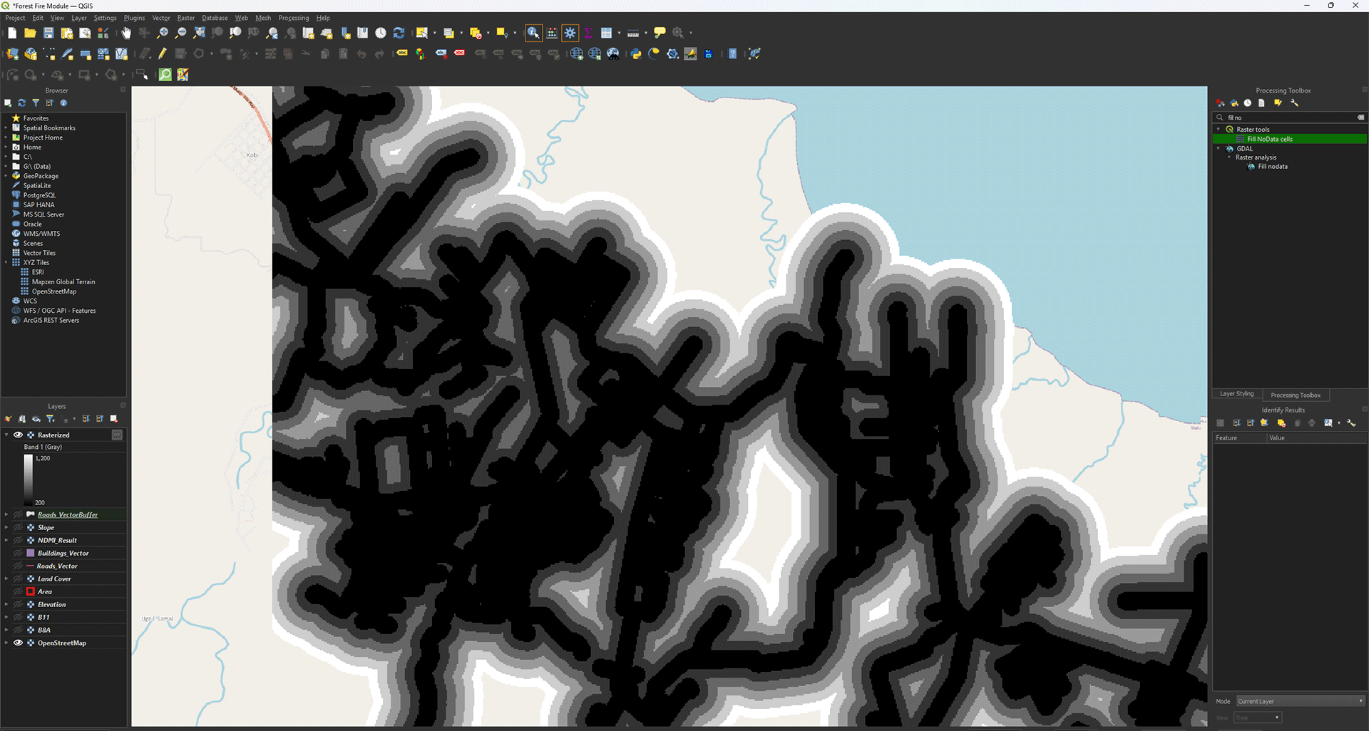 We have converted the vector layer to a raster. This will make the buffer analysis a lot less heavy on processing.